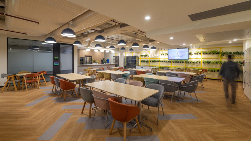 Our work with HP Inc. in India showcases a vibrant LEED Gold-certified hybrid workspace where sustainability meets innovation. The office integrated biophilic design elements—a living green wall featuring HP's logo serves as a centrepiece—creating a calming natural ambiance.
